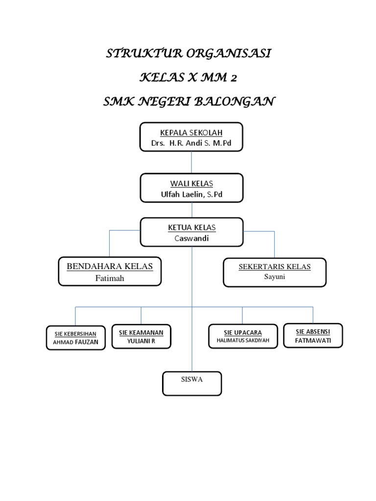 Tasnim guru kelas i a,guru kelas iia,guru kelas ii b,guru kelas iii,guru kelas iv asih,listiara mahdalia,lis damayanti,sarto,etty sumiati guru kelas v,guru kelas vi,guru pendais,guru penjas,guru sbk komasih. Contoh sederhana struktur organigram kelas semua jenjang sekolah tahun ajaran 2016 2017 dengan microsoft word microsoft excel microsoft word words. Cara membuat struktur organisasi kelas keren unik dan kreatif. Biasanya, sekretaris sering diminta tolong para guru untuk membantu menuliskan materi di papan tulis agar siswa lainnya bisa mencatat. Unduh sebagai doc, pdf, txt atau baca online dari scribd.